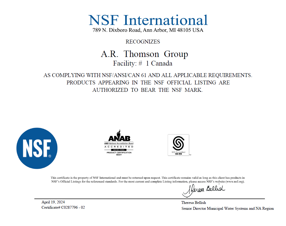 By undergoing NSF auditing at its Surrey facility, AR Thomson demonstrates that its gasket cutting processes, quality controls, and material handling meet the same rigorous standards applied to certified drinking water system components.